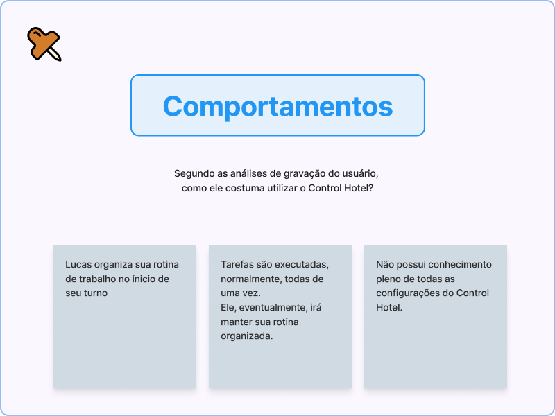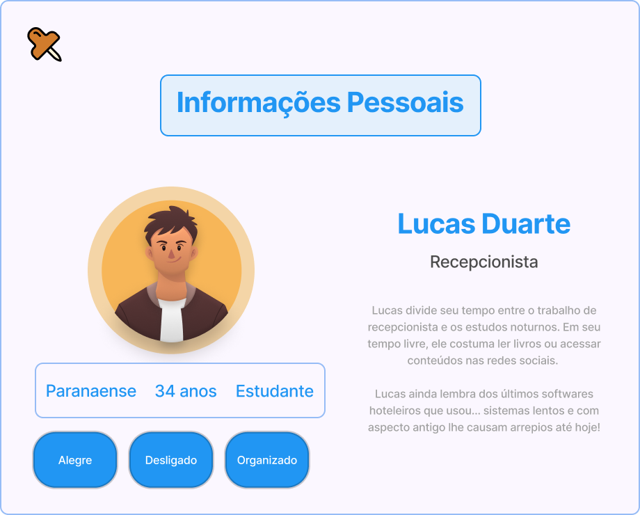 Por questões de sigilo de informações, apenas um exemplar de persona será exposto. Entretanto, foram modelados 4 perfis de persona: um gestor hoteleiro, um recepcionista, uma assistente de reservas e marketing e uma governanta.